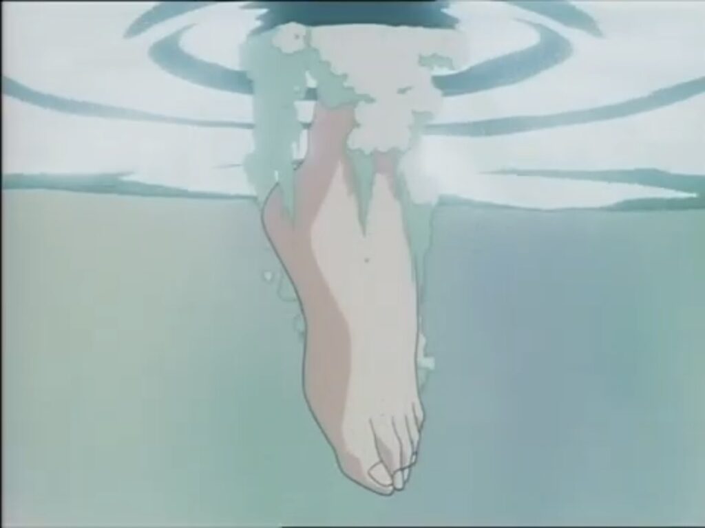 亜紀の全身が水面へ飛び込む動きと、湯船の水面に入った後の亜紀の足……この「水面に何かが入る」という動きの共通点で見事にカットを繋いでいます!